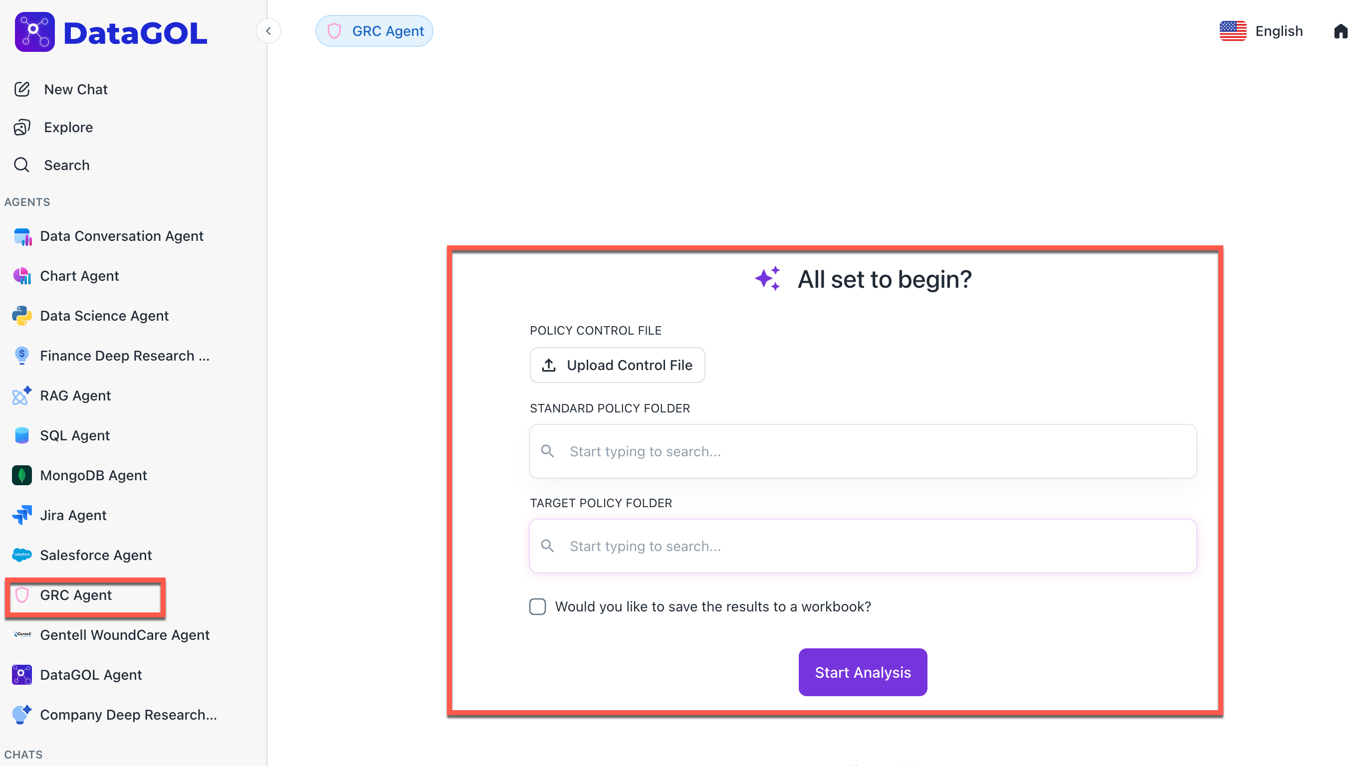 From the DataGOL Home page, navigate to the Agents section and select GRC Agent