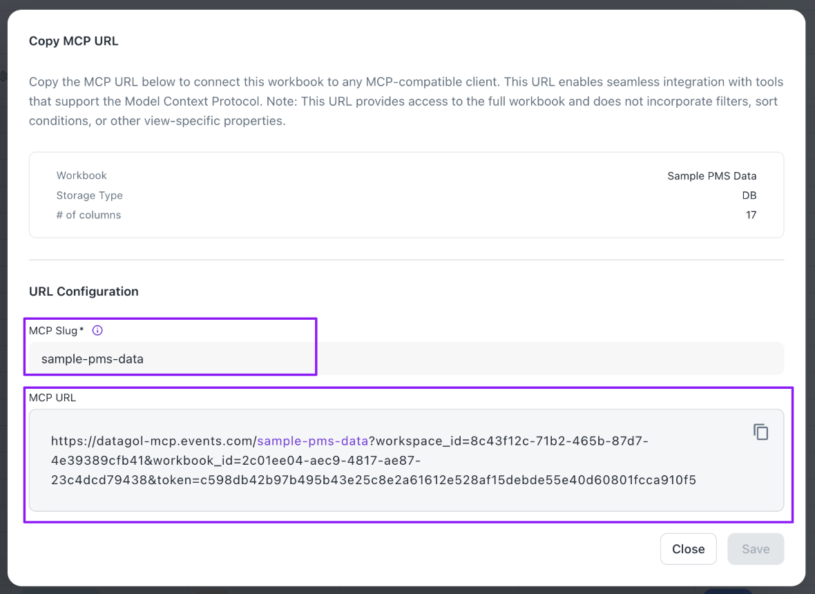 - Click the option. A dialog will appear displaying the unique MCP URL for this workbook.