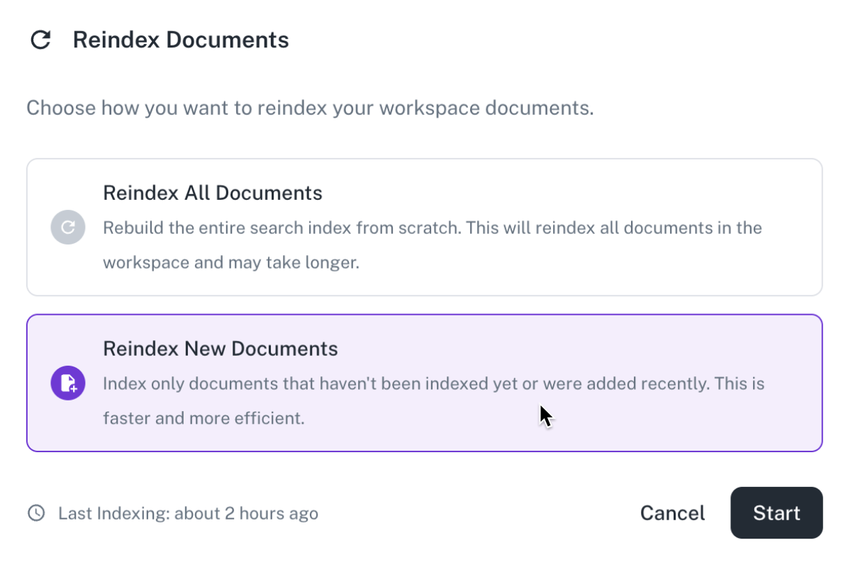 Document re-indexing option: A new option has been added to the Documents user interface, allowing users to trigger re-indexing for a workspace manually. This feature enables users to refresh the search and index state on demand. Users may choose between an incremental re-index, which processes only new or changed items, or a full re-build, which clears the existing index and re-ingests all documents.