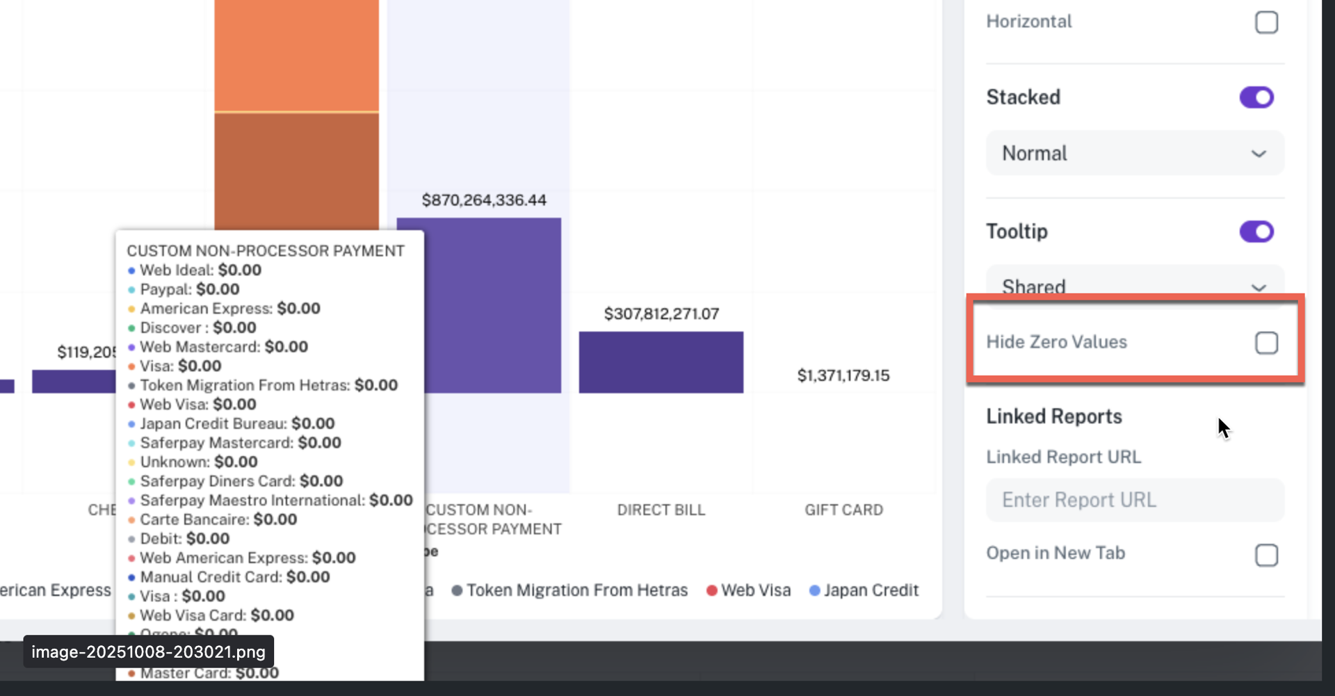 Customizable display: Previously, categories with a zero value sometimes appeared when hovering over a grouped bar chart, adding visual clutter. You can now toggle a setting to explicitly hide these zero-value columns.