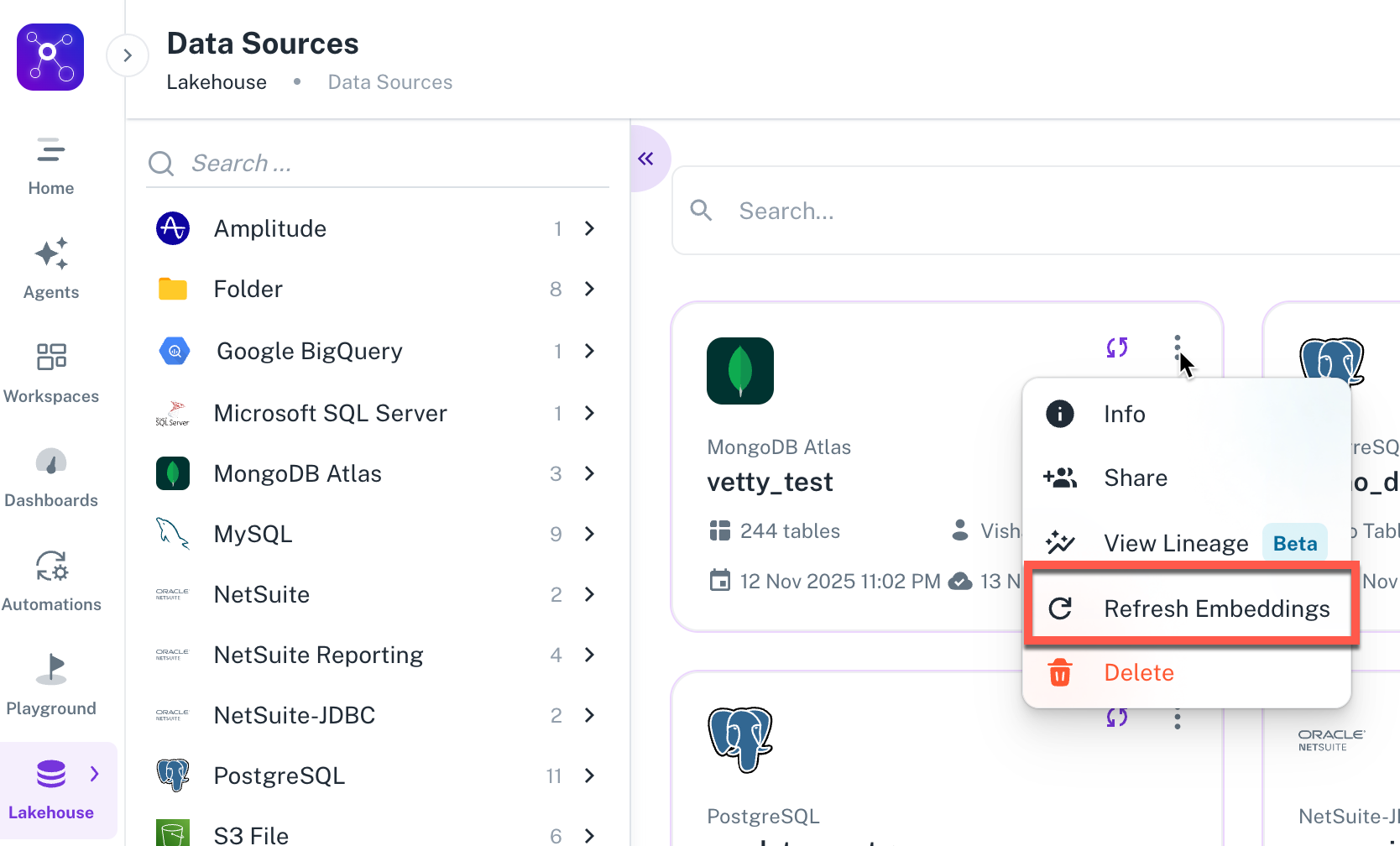 Users can now manually trigger the regeneration of vector embeddings for a specific data source at any time. Clicking the "Refresh Embeddings" button in the UI sends an immediate request to the AI server. Regenerating embeddings ensures the AI models are working with the most up-to-date vector representations of the data source schema, leading to improved accuracy and relevance in AI-driven queries. No manual backend intervention: This enhancement eliminates the need for manual backend processes to update embeddings.